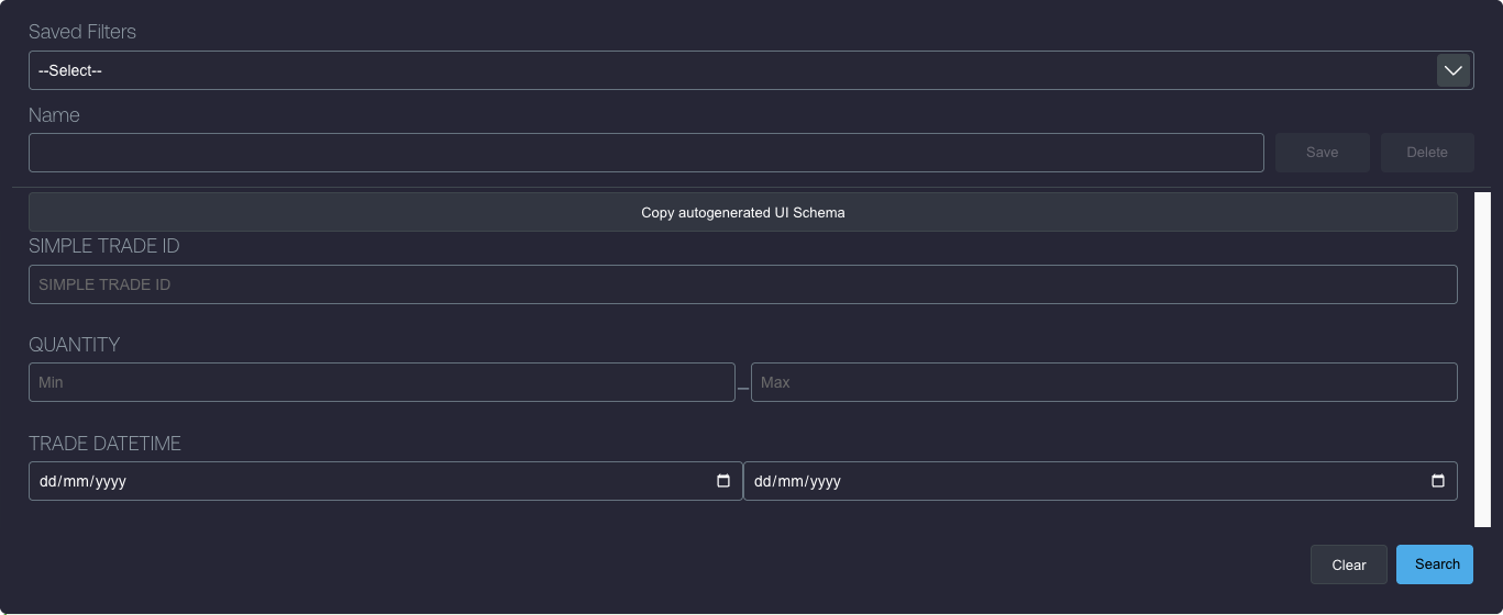 You can provide a UISchema to the filter in order to customise which fields should be displayed in the filter forms. In the example below, we set only the fields QUANTITY and SIDE.